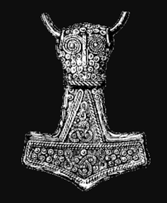 Dessin d’un pendentif Mjölnir en argent plaqué or de l’âge viking (longueur 4,6 cm) trouvé à Bredsätra à Öland, Suède, aujourd’hui conservé au Musée suédois des Antiquités nationales. Wikipédia